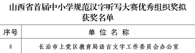 12月8日,省教育厅公示山西省首届中小学规范汉字听写大赛拟获奖名单。本次大赛设小学低年级组(1至3年级)、小学高年级组(4至6年级)和初中组三个组别,共评选出团体一等奖6个、二等奖9个、三等奖18个。
