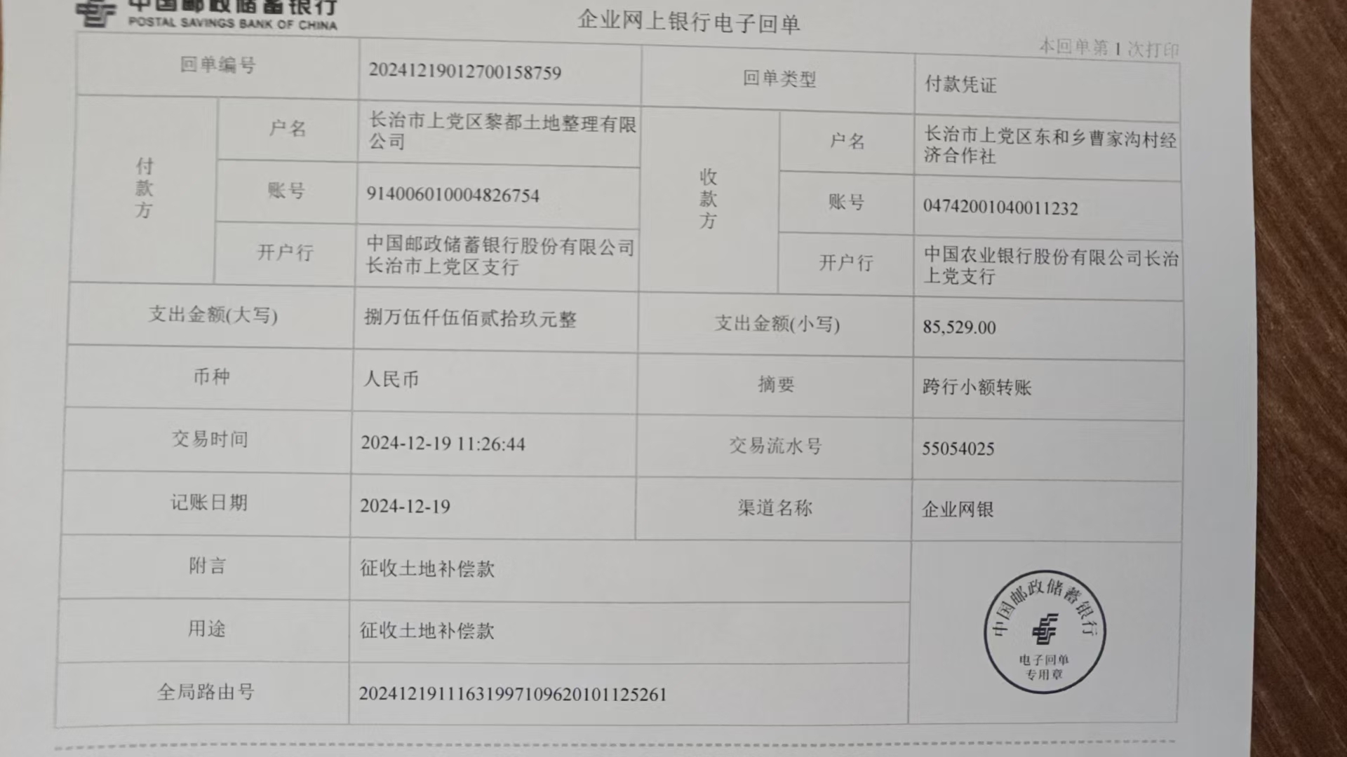 长治市上党区东和乡曹家沟村征地补偿款电子回单(1.4973亩).jpg