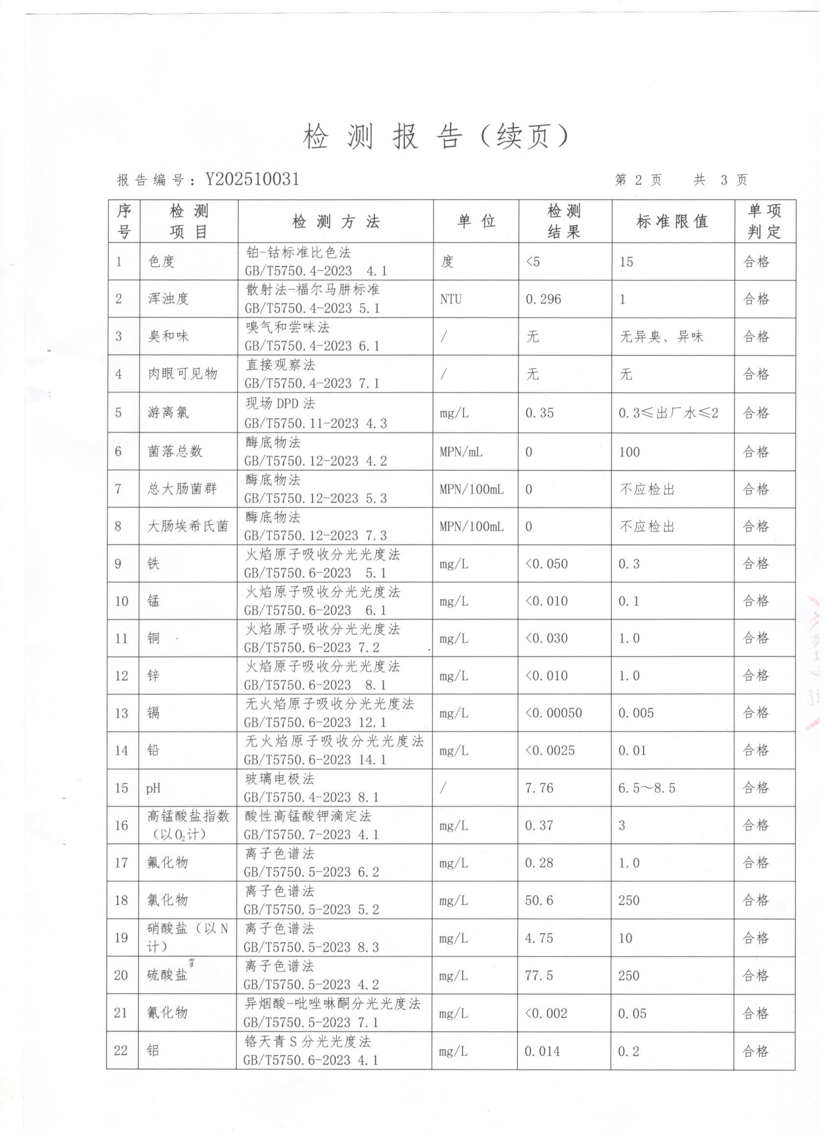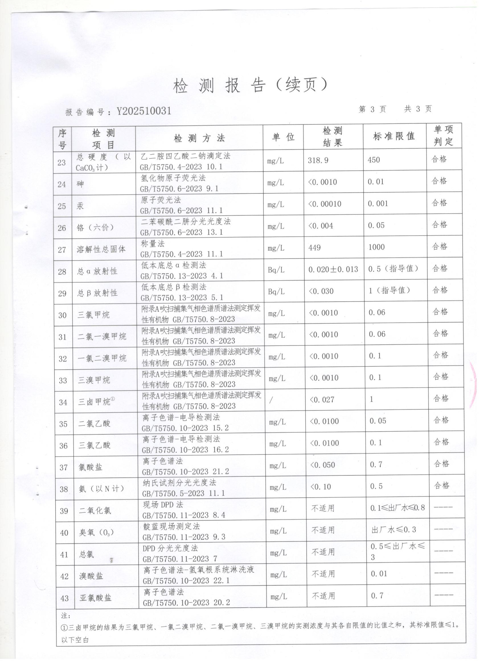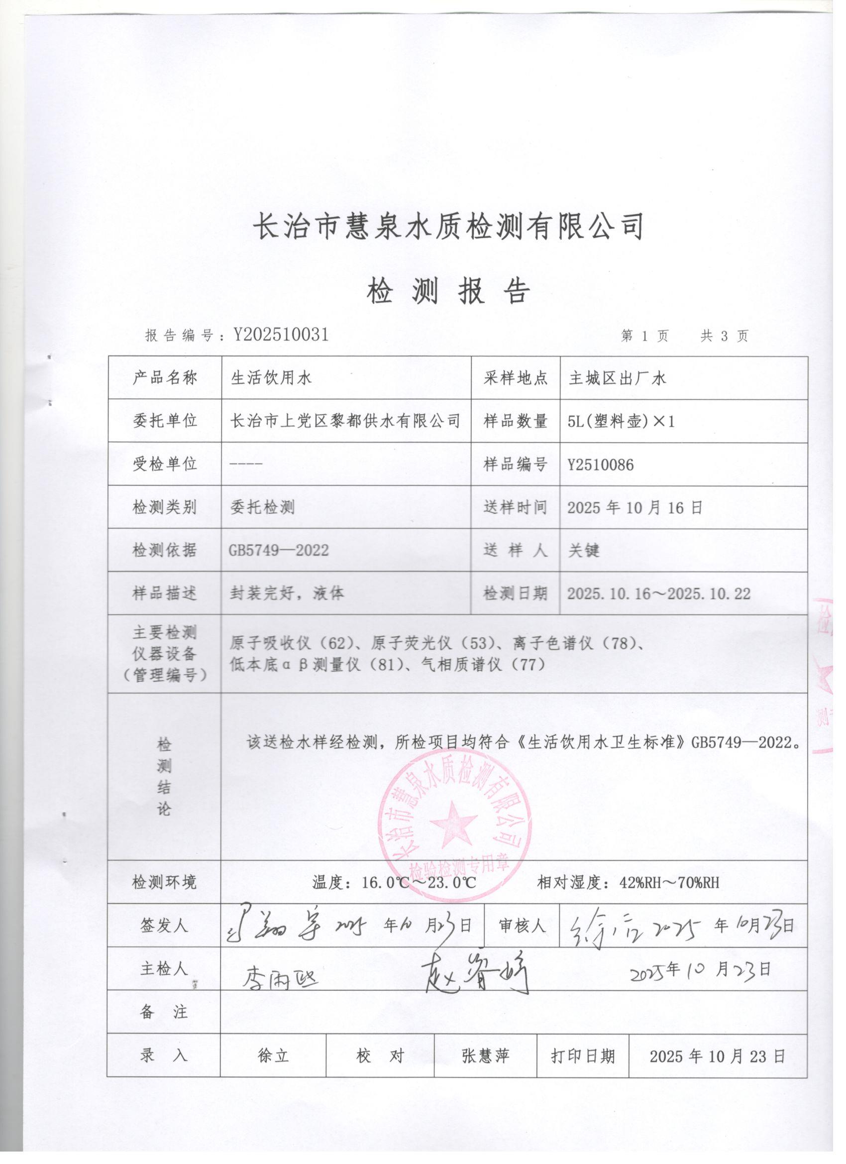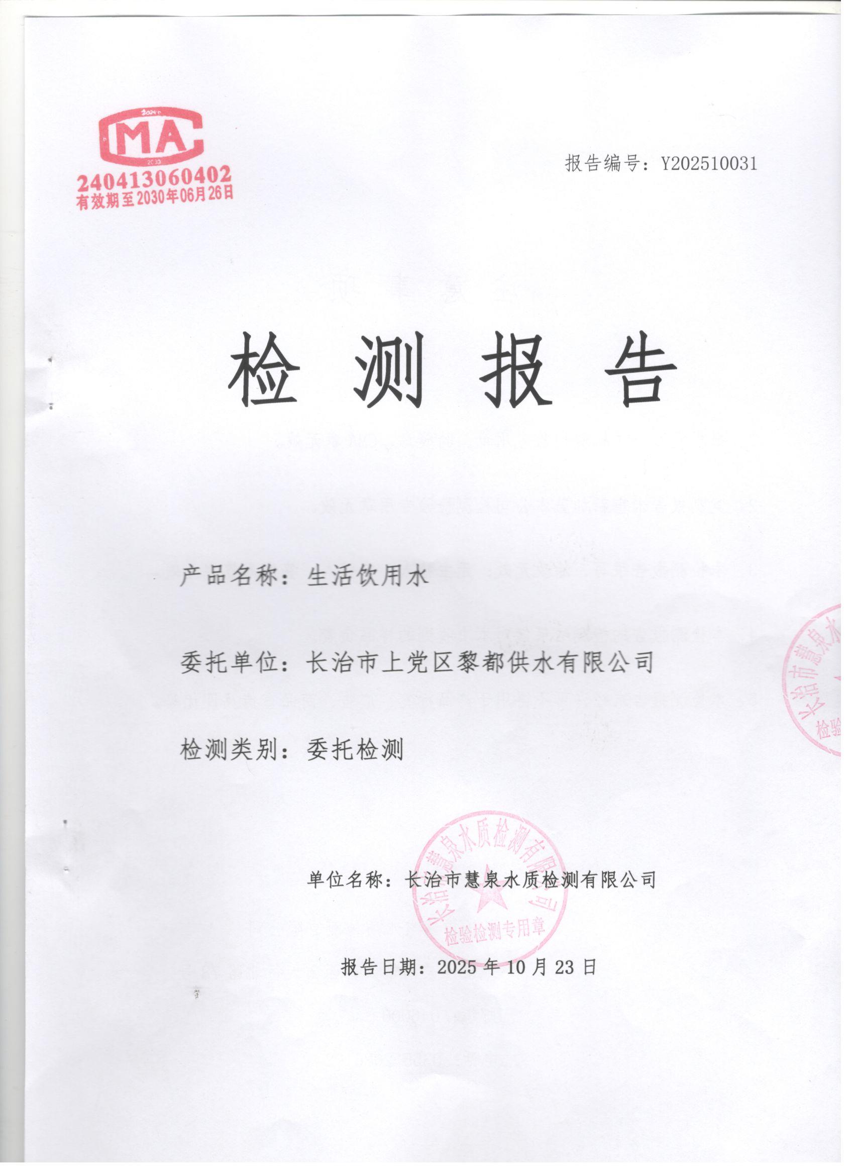 现将上党区2025年10月份水质检测报告公告如下: