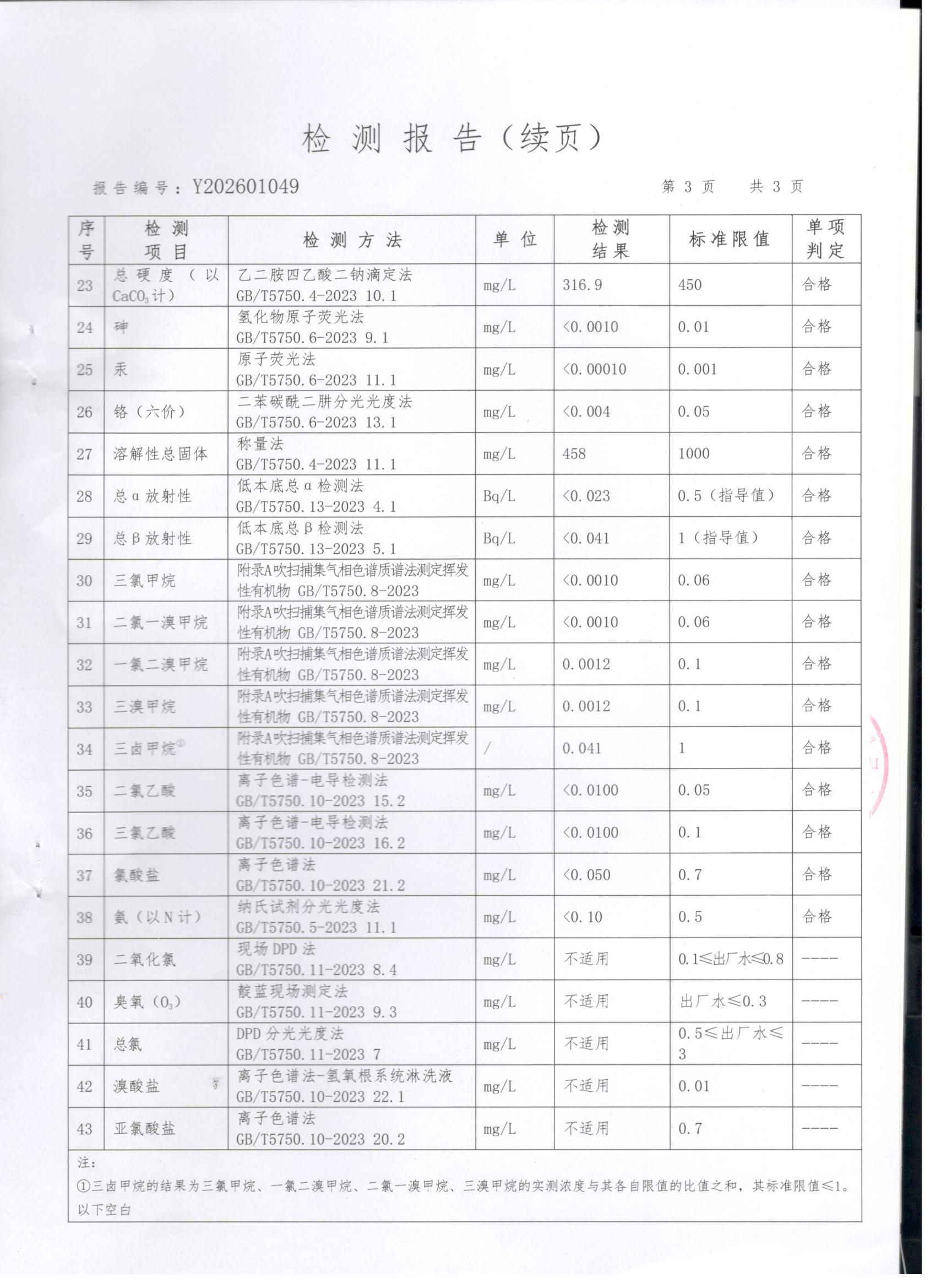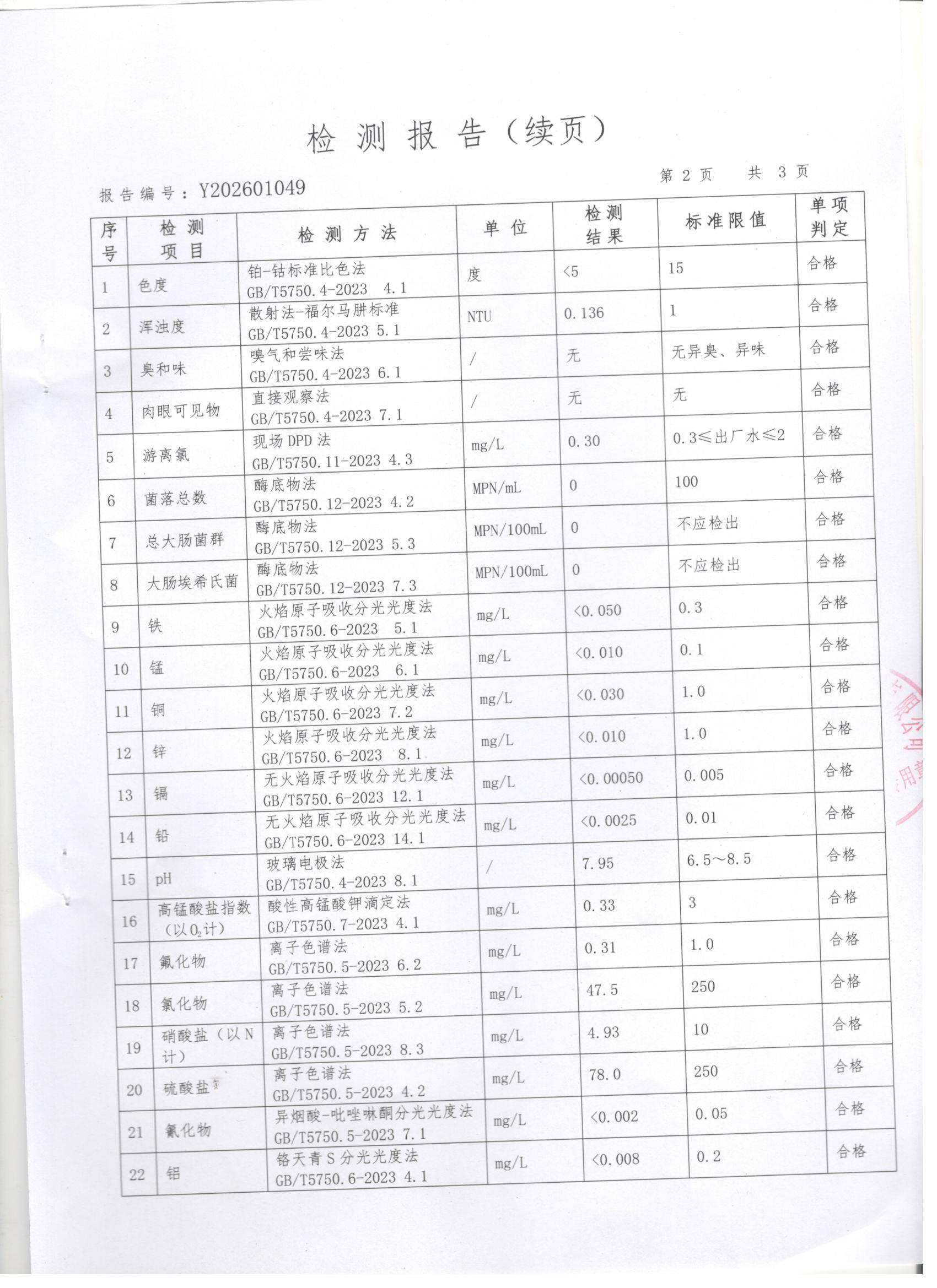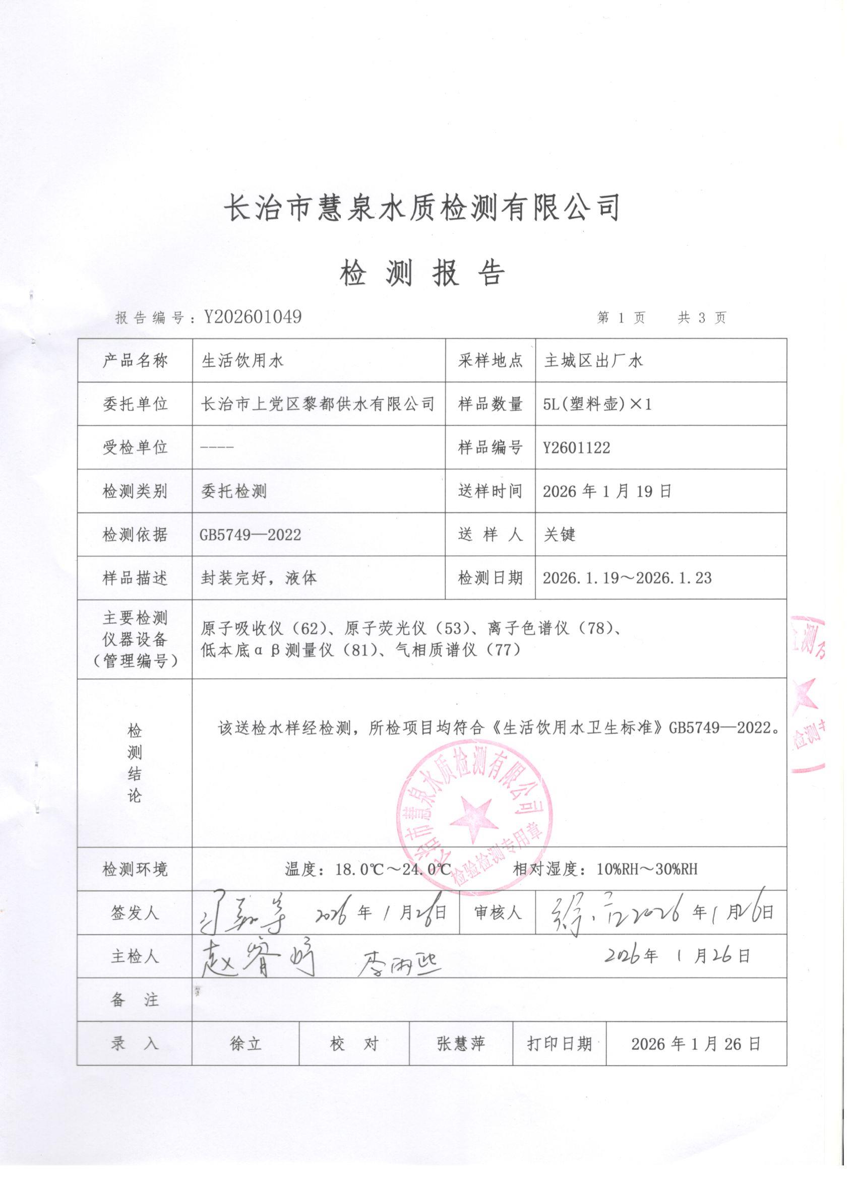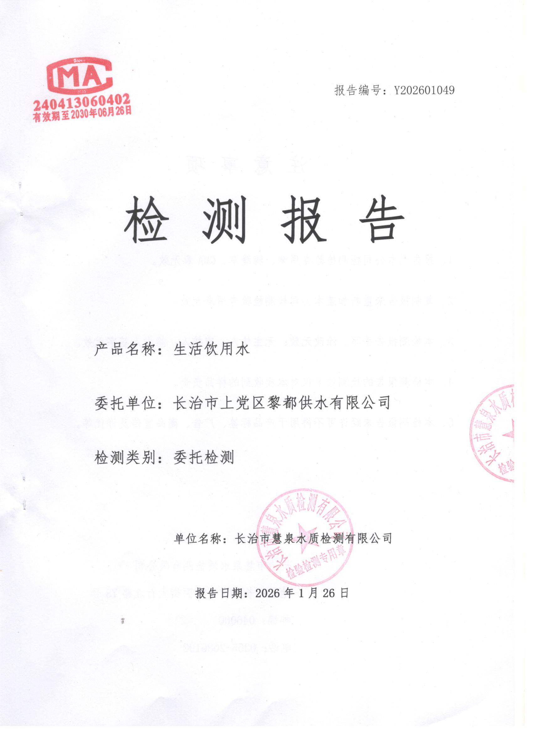 上党区2026年1月份水质检测报告