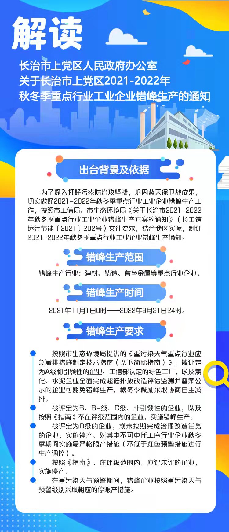 原文链接:长治市上党区人民政府办公室关于长治市上党区2021-2022年秋冬季重点行业工业企业错峰生产的通知