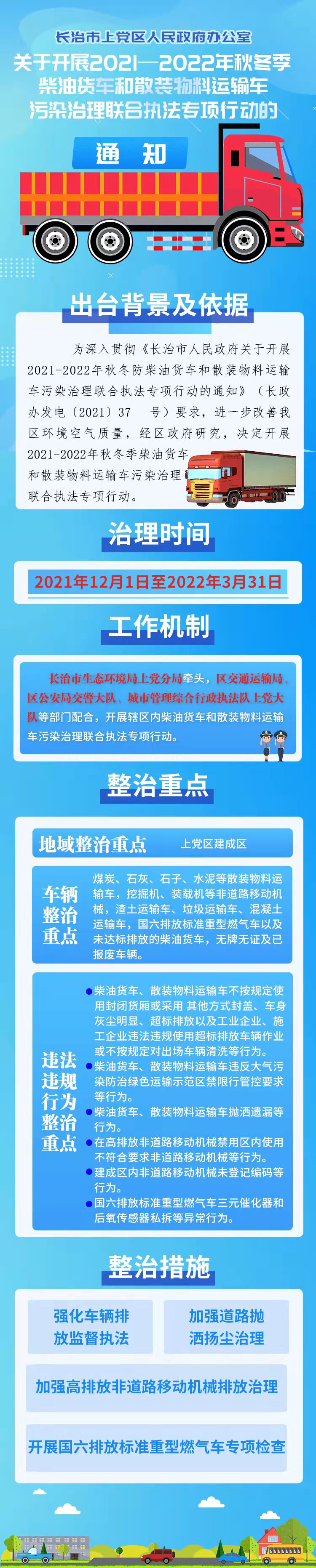 原文链接:长治市上党区人民政府办公室关于开展2021—2022年秋冬季柴油货车和散装物料运输车污染治理联合执法专项行动的通知