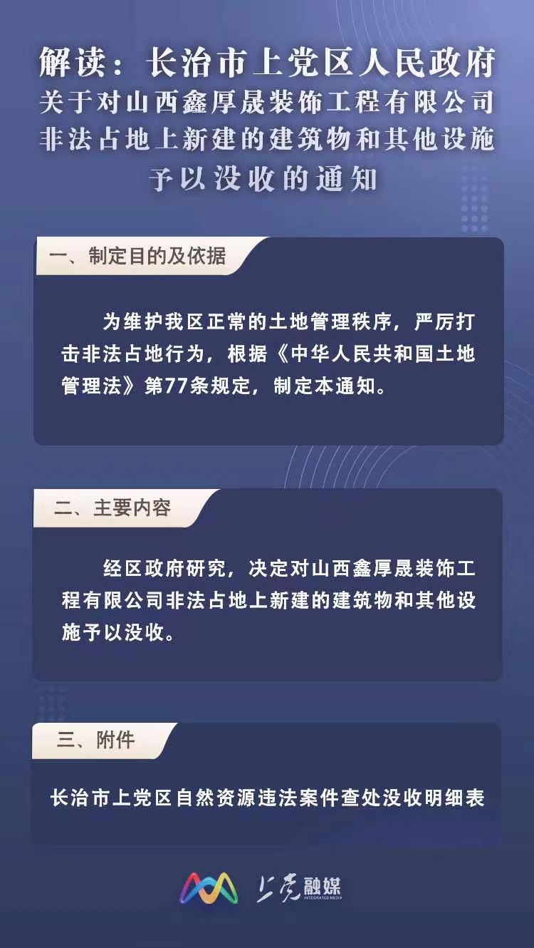 原文链接:长治市上党区人民政府关于对山西鑫厚晟装饰工程有限公司非法占地上新建的建筑物和其他设施予以没收的通知